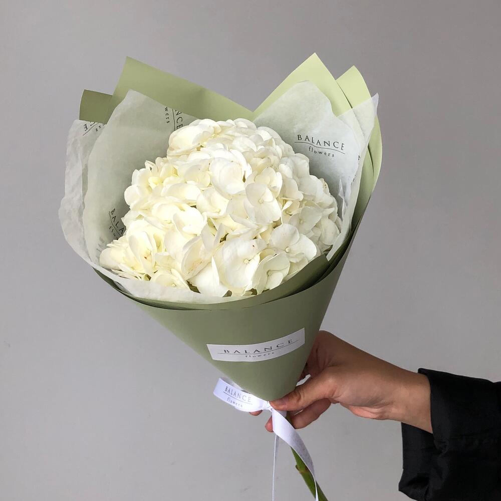 Молочная гортензия в лаконичной упаковке – прекрасный комплимент для любого повода или без него.