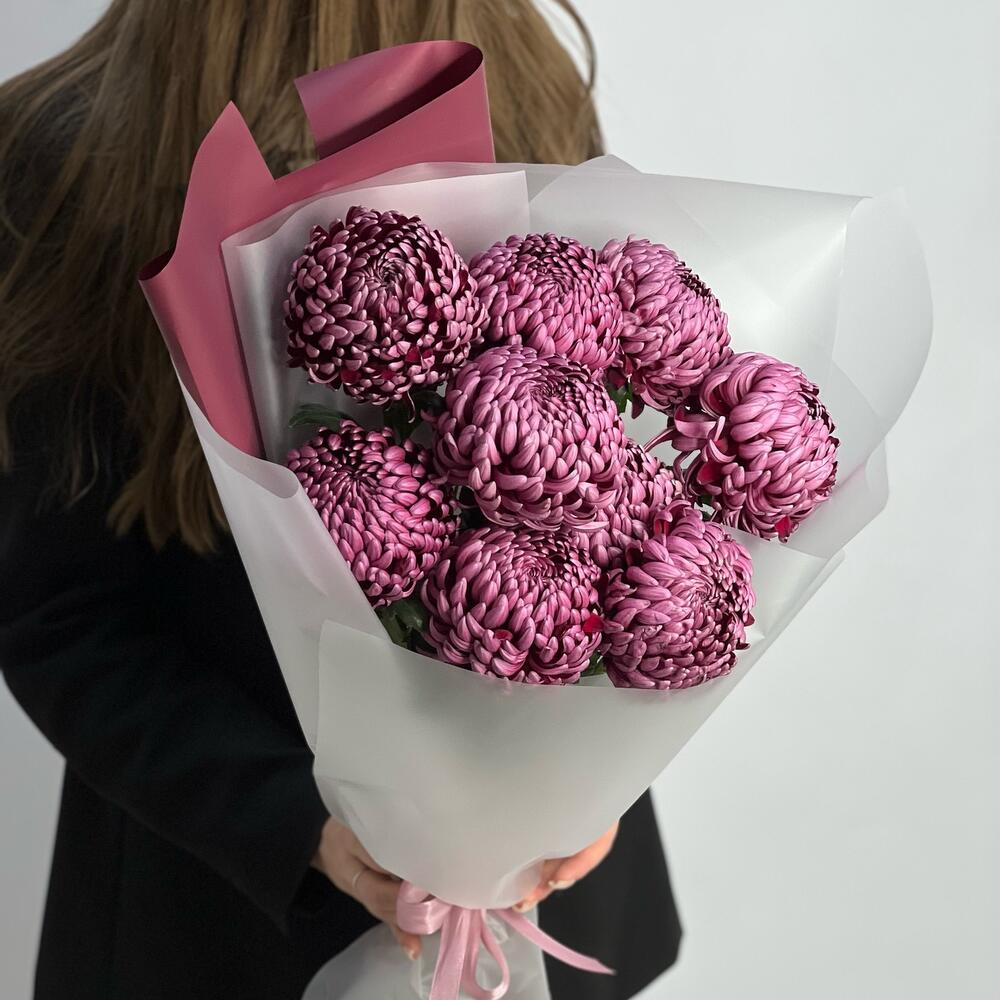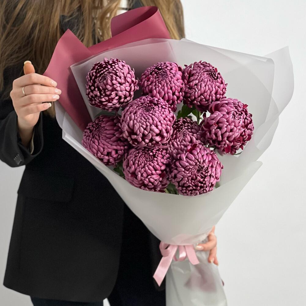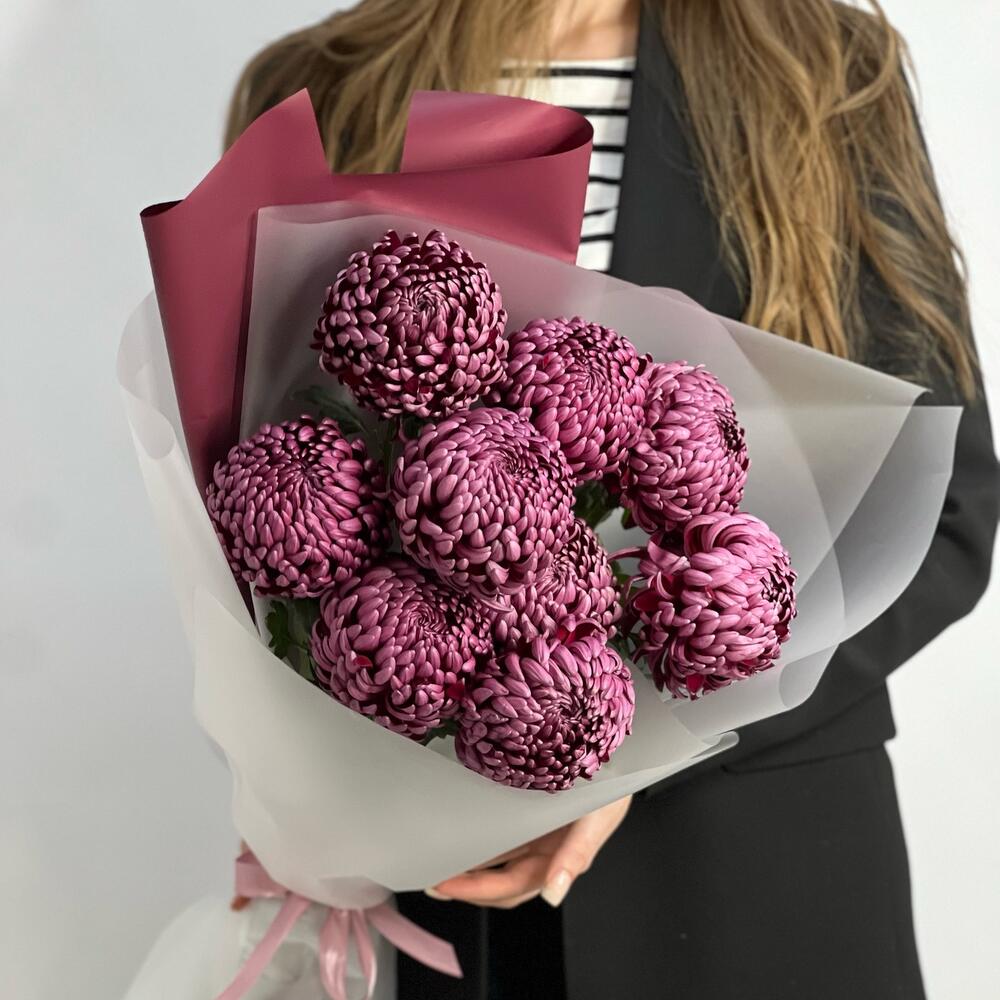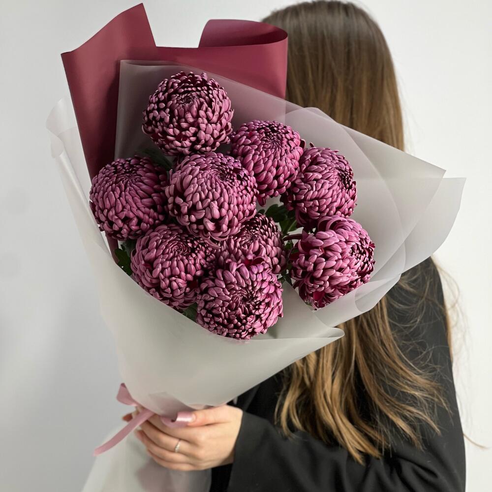 Пышный букет из винных хризантем сорта бигуди. Этот букет порадует вашу девушку и поможет разогреть в ней чувства.